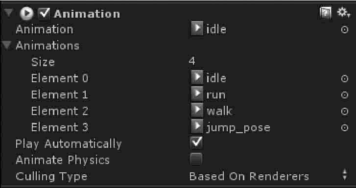 | Culling Mode | 动画的裁剪模式 | 设置动画是否裁剪以及裁剪模式 |