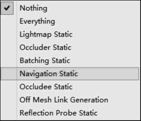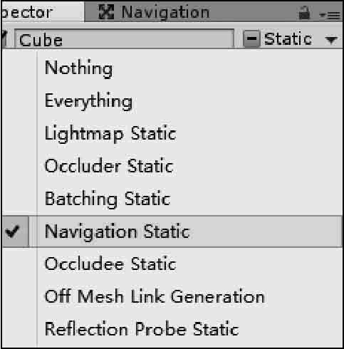 NavMesh 的设置方法很简单,在 Hierarchy 视图中选中场景中除了目标和主角以外的游戏对象,在 Inspector 视图中单击 Static 下拉列表,在其中勾选 Navigation Static 即可,如下图所示。
