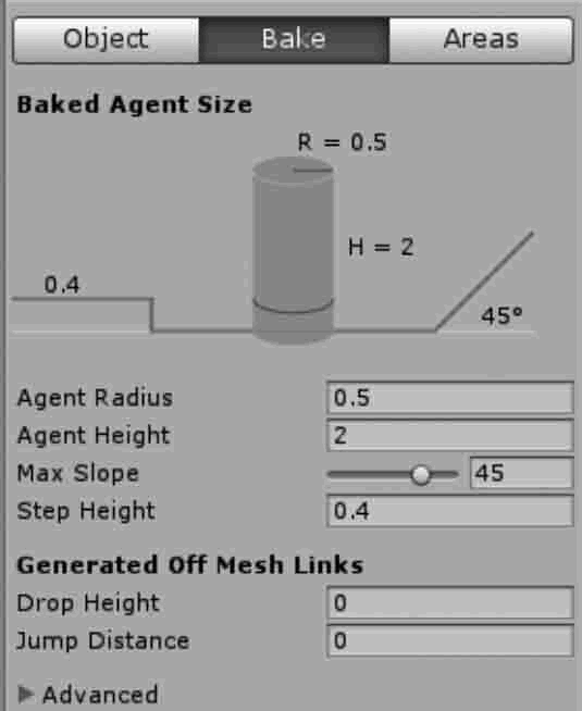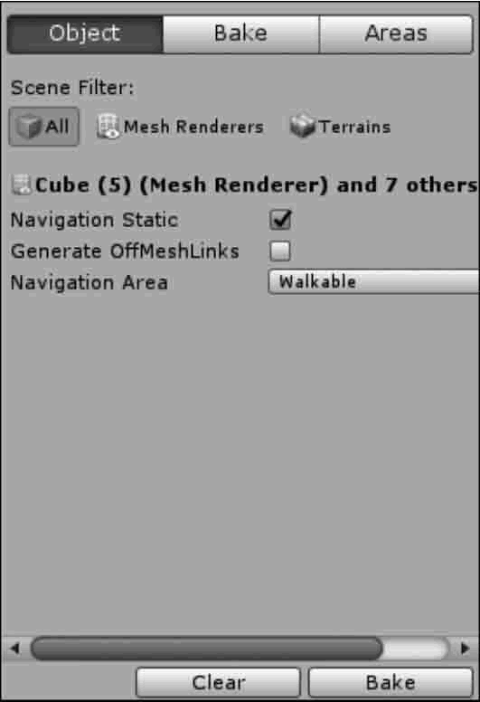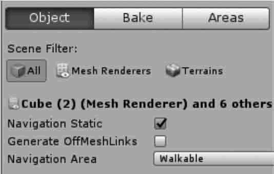 接下来详细看看 Navigation 面板,它有 Object、Bake、Areas 这 3 个标签页。