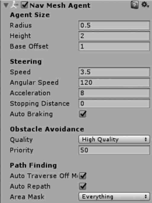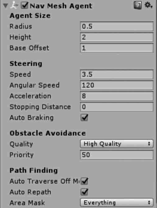 导航代理(Navigation Agent)可以理解为去寻路的主体。在导航网格生成之后,给游戏对象添加了一个 Nav Mesh Agent 组件,如下图所示。