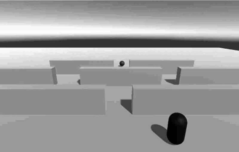 步骤 1):新建三维场景,将其命名为 Navigation。其中,胶囊体作为动态移动的对象,球体作为导航的目标,如下图所示。
