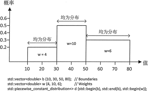 图 1 中的分布定义了 3 个区间,每个都有自己的权重。这 3 个区间是由定义在容器 b 中的 4 个边界值定义的。每个区间都有一个由容器 w 中的元素定义的权重。它的前两个参数是指定边界序列的迭代器,第三个参数是指向权重序列的第一个元素的迭代器。每个区间内的值都是均勻分布的,特定区间内的随机值的概率是由这个区间的权重决定的。