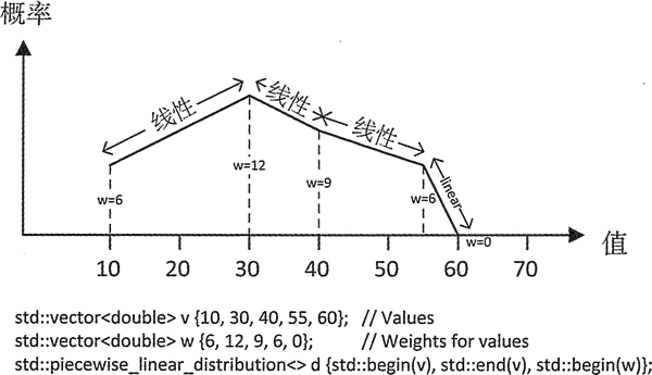 std::piecewise_linear_distribution<> d {std::begin(v), std::end(v), std::begin(w)};
