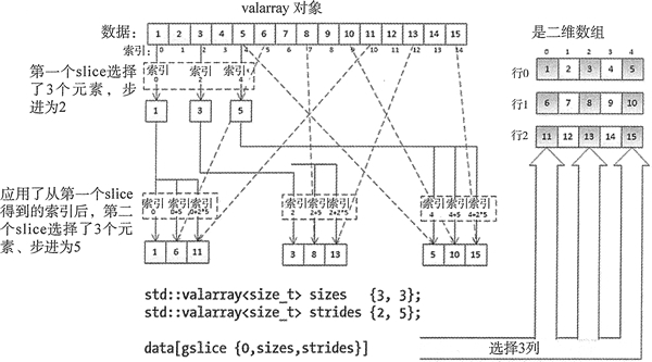 这两行分别从索引值 0 和 10 开始;这些索引值是从作为 gslice 的构造函数的第一个参数的起始索引 0 定义的第一个 slice 得到的,并且第一个 slice 的大小及对应的步进值在作为 gslice 构造函数的第二和第三个参数的 valarray 对象中。每行有 5 个连续的元素,第二个 slice 的所选行的大小是 5,对应的步进值是 1。注意,不必显式地定义 sizes 和 strides。可以将选择这两行的表达式写为: