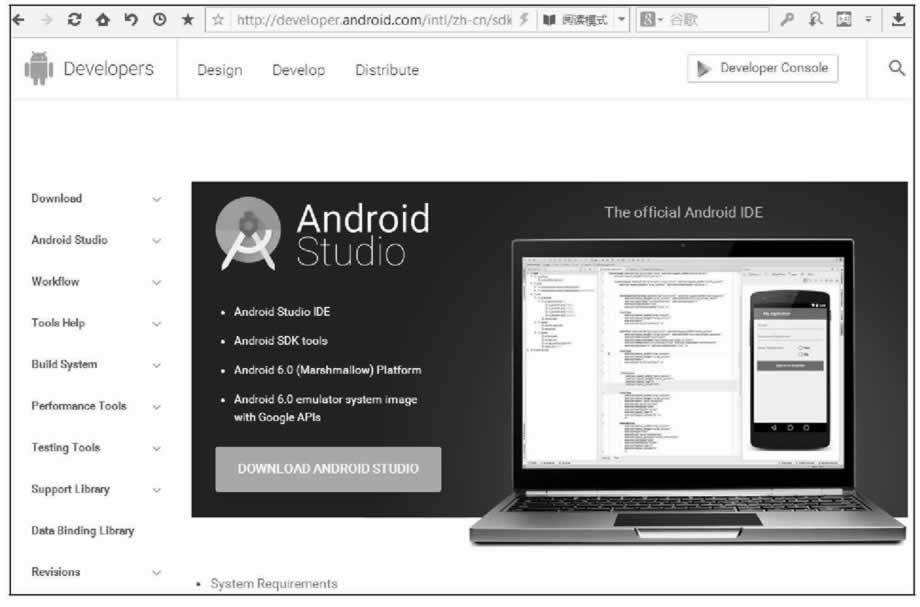 开发 Android 应用程序需要下载相关的 Android SDK。到 http://developer.Android.com/sdk/index.html 开发网页,如图 1 所示,根据自己的操作系统下载 Android SDK 软件开发包。本教程下载的是 Android 7.0 版本(API Level 24)。本教程使用官方推荐的 Android Studio 进行开发,版本号是 2.2.3,Gradle 版本是 2.3.3。