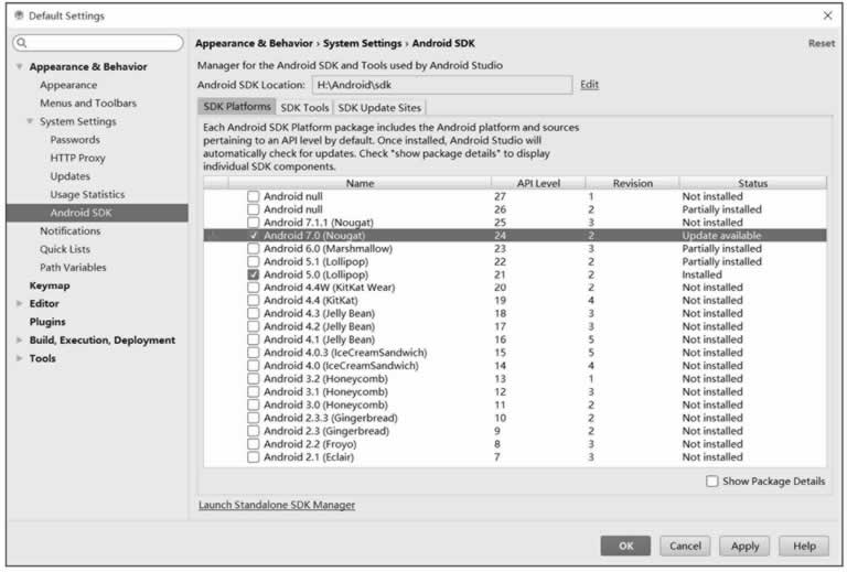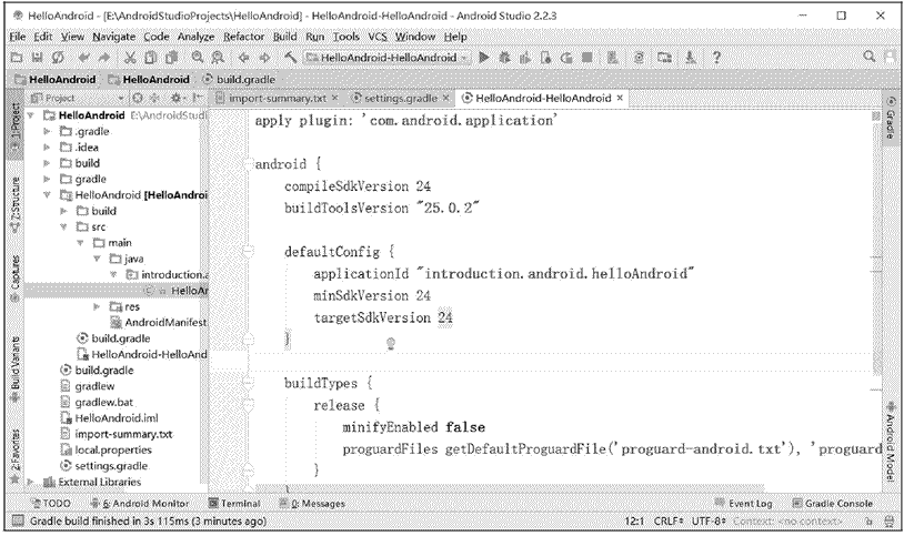本教程下载的是 Android 7.0 版本(API Level 24)。本教程使用官方推荐的 Android Studio 进行开发,版本号是 2.2.3,Gradle 版本是 2.3.3。