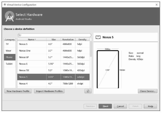如图 7 所示。总体而言,界面分为左中右三部分,左侧为 TV、Wear、Phone、Tablet 四个类别,说明 Android 7 对电视、可穿戴设备、手机和平板的开发都提供了支持;中间一列为针对左侧的某个类别已经建立好的虚拟设备的配置文件,可基于配置文件直接创建虚拟设备;右侧为配置文件的图形化描述,包括屏幕尺寸、现实精细度等。