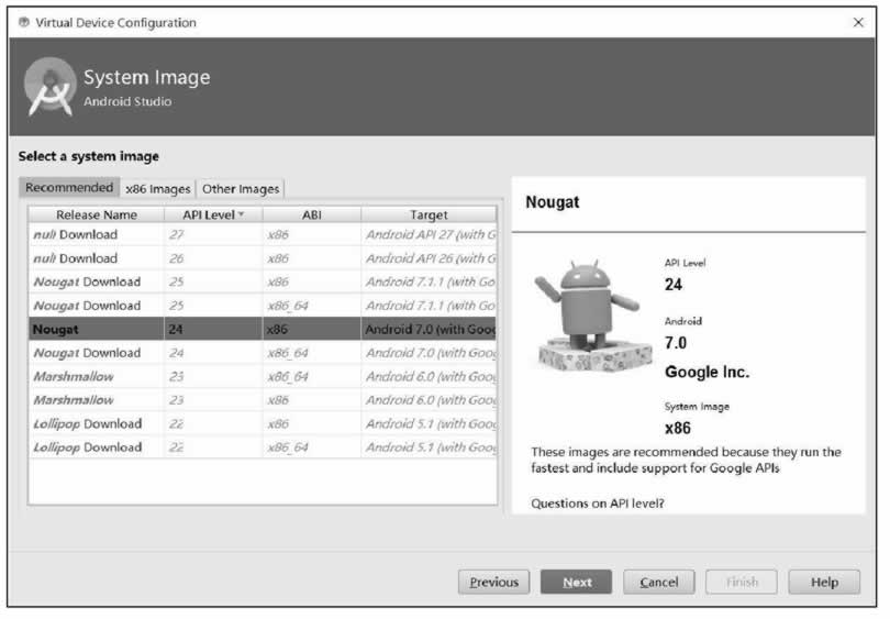 例如,要基于 Nexus S 配置文件创建虚拟手机,其分辨率为 480×800,现实效果为 hdpi,需要在左侧单击“Phone”,在中间选择“Nexus S”配置文件,然后单击“Next”按钮,出现系统映像选择界面。如图 8 所示,选择系统映像文件,决定虚拟手机的 Android 系统版本、系统架构以及 API 等级。