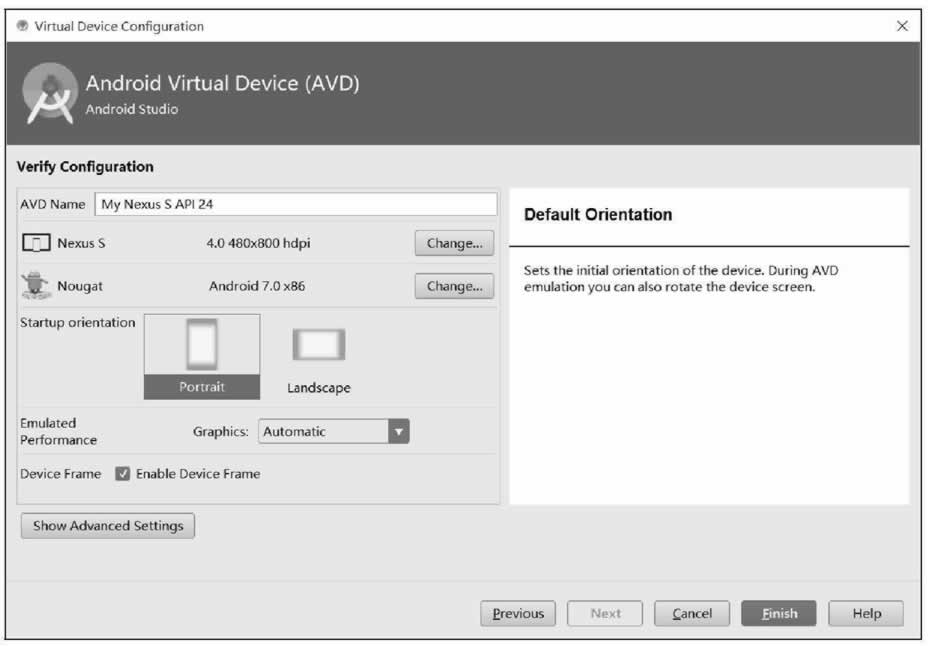 选择 Nougat,API Level 为 24,架构为 x86,单击“Next”按钮,进入虚拟设备参数配置界面。如图 9 所示,为虚拟手机设备起一个名字,并可对虚拟设备的分辨率、Android 系统版本、横屏还是竖屏、3D 绘图使用硬件加速还是软件加速等信息进行配置。