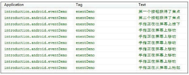 当用户在屏幕上做移动触摸、单击按钮等操作时,主 Activity MainActivity 会捕获相应事件并进行处理,在 LogCat 中打印相关内容,运行效果如图 2 所示。