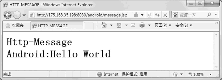 由于本地计算机在网络上的 IP 为 175.168.35.198,因此 message.jsp 的网络 URL 为 http://175.168.35.198:8080/android/message.jsp。将该地址输入 IE 地址栏打开,其运行效果如图 1 所示。