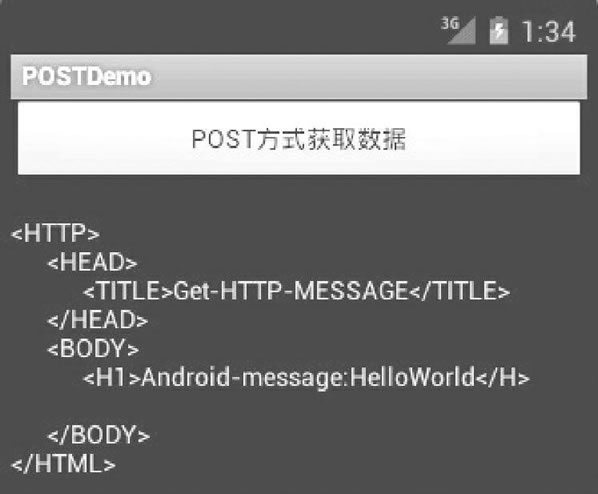 上一节教程我们演示了 Android 使用 GET 获取网络资源的运行效果和实例,下面实例 POSTDemo 中演示了使用 POST 方式访问 getMessage.jsp 的过程,运行效果如图 1 所示。