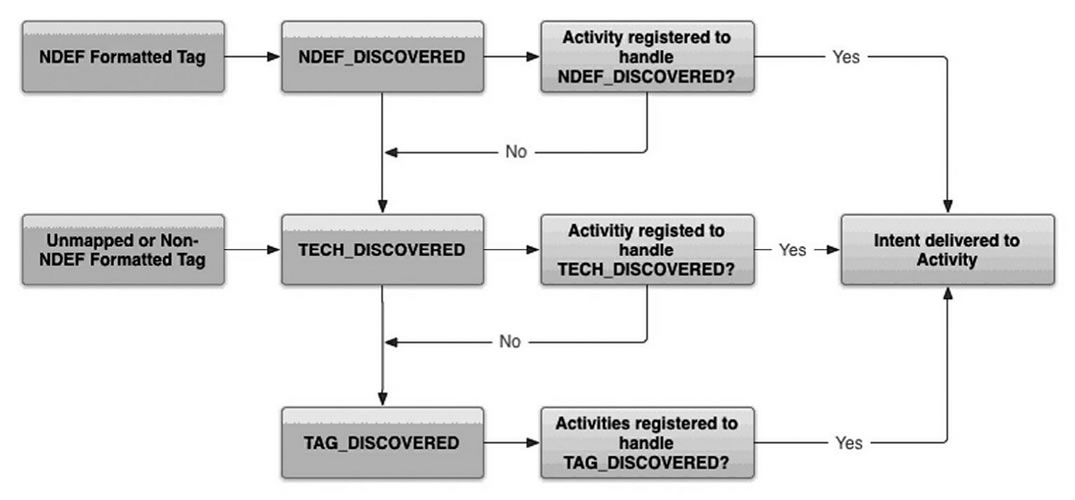 若 NDEF_DISCOVERED Intent 已经被启动,则 TECH_DISCOVERED和TAG_DISCOVERED Intent 将不会被启动。