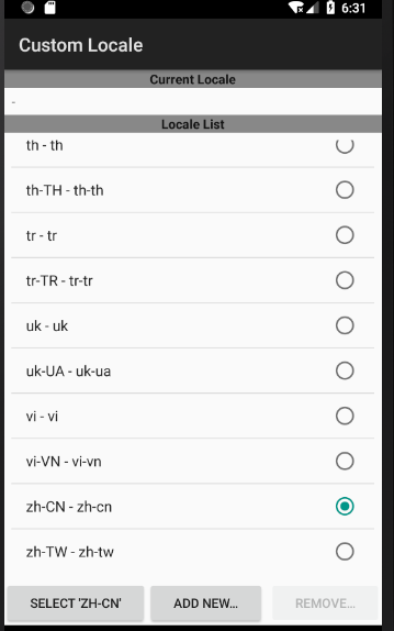 若更改当前区域为“zh_CN”,并单击 Select'zh_CN' 按钮,则当前手机被设置为汉语,地区为中国大陆地区,运行效果如图 3 所示,可以看到列表中的部分语言变为了中文。