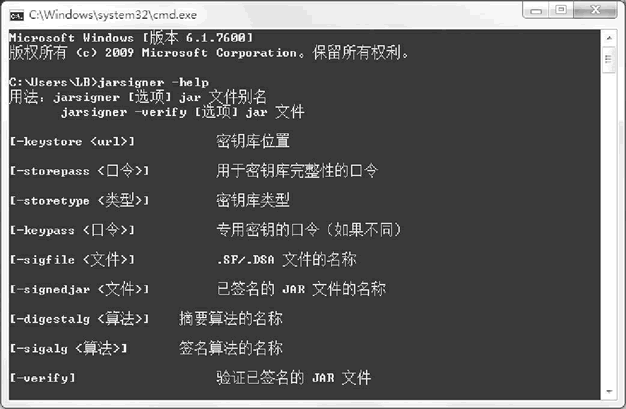 使用命令方式进行签名,使用的是 jarsigner 命令,该命令和 keytool 命令一样,被放置在 <JDK的安装目录>\bin 文件夹下。在 cmd 窗口中运行“jarsigner –help”命令,显示该命令的各个参数的具体用法,如图 3 所示(在此不一一介绍)。