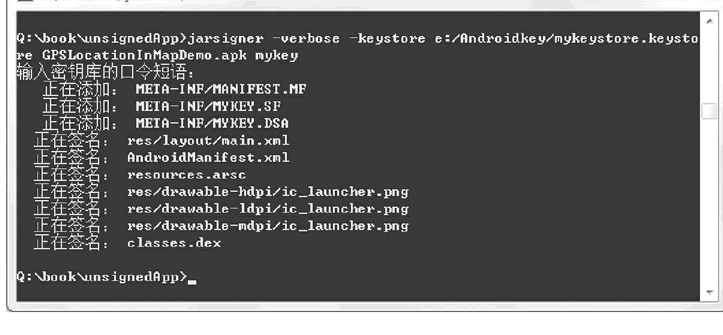 使用 jarsigner 为 GPSLocationInMap.apk 文件签名的命令为“jarsigner -verbose -keystore e:/Androidkey/mykeystore.keystore GPSLocationInMapDemo.apk mykey”,其中: