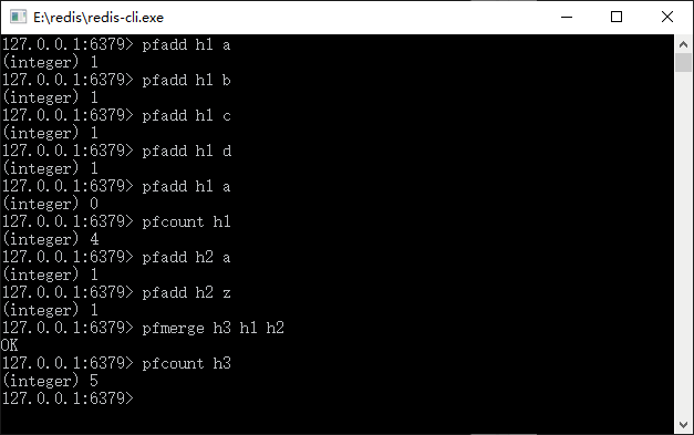 分析一下逻辑,首先往一个键为 h1 的 HyperLogLog 插入元素,让其计算基数,到了第 5 个命令“pfadd h1 a”的时候,由于在此以前已经添加过,所以返回了 0。它的基数集合是 {a,b,c,d},故而求集合长度为 4;之后再添加了第二个基数,它的基数集合是{a,z},所以在 h1 和 h2 合并为 h3 的时候,它的基数集合为 {a,b,c,d,z},所以求取它的基数就是 5。
