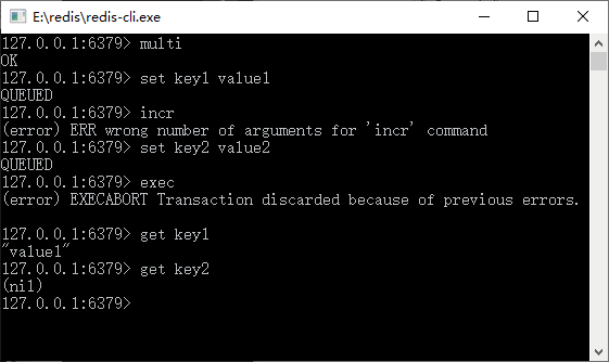当 exec 命令执行后,之前进入队列的命令就依次执行,当遇到 incr 时发生命令操作的数据类型错误,所以显示出了错误,而其之前和之后的命令都会被正常执行。注意,这里命令格式是正确的,问题在于数据类型,对于命令格式是错误的却是另外一种情形,如图 2 所示。