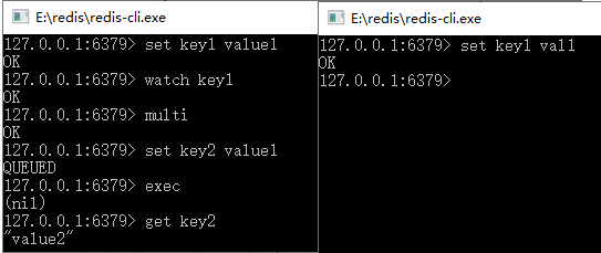 这里我们使用了 watch 命令设置了一个 key1 的监控,然后开启事务设置 key2,直至 exec 命令去执行事务,这个过程和图 2 所演示的一样。