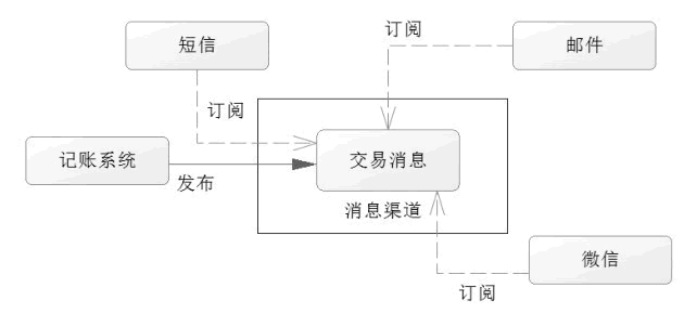 这里建立了一个消息渠道,短信系统、邮件系统和微信系统都在监听这个渠道,一旦记账系统把交易消息发送到消息渠道,则监听这个渠道的各个系统就可以拿到这个消息,这样就能处理各自的任务了。它也有利于系统的拓展,比如现在新增一个彩信平台,只要让彩信平台去监听这个消息渠道便能得到对应的消息了。