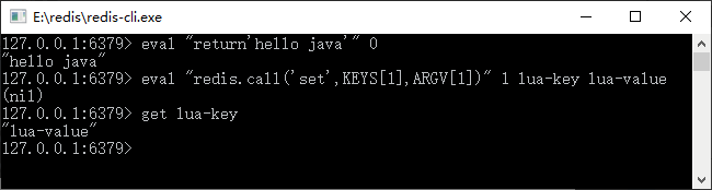 jedis.eval("redis.call ('set', KEYS [1],ARGV [1])", 1, "lua-key",