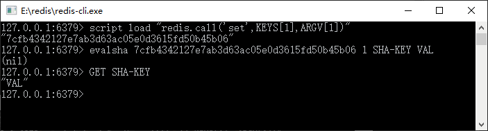 这个脚本的返回值是一个 SHA-1 签名过后的标识字符串,我们把它记为 shastring。通过 shastring 可以使用命令执行签名后的脚本,命令的格式是:evalsha shastring keynum [key1 key2 key3 ...] [param1 param2 param3 ...]