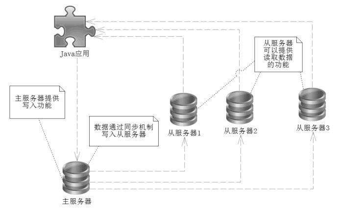 - 存在多台从服务器,从服务器不写入数据,只负责同步主服务器的数据,并让外部程序读取数据。