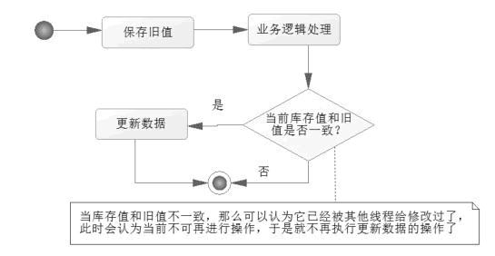 当需要扣减红包的时候,先比较数据库当前的值和旧值是否一致,如果一致则进行扣减红包的操作,否则就认为它已经被其他线程修改过了,不再进行操作,CAS 原理流程如图 1 所示。