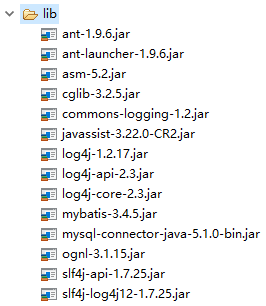 在 MyEclipse 中创建一个名为 myBatisDemo01 的 Web 应用,将 MyBatis 的核心 JAR 包、依赖 JAR 包以及 MySQL 数据库的驱动 JAR 包一起复制到 /WEB-INF/lib 目录下。添加后的 lib 目录如图 1 所示。