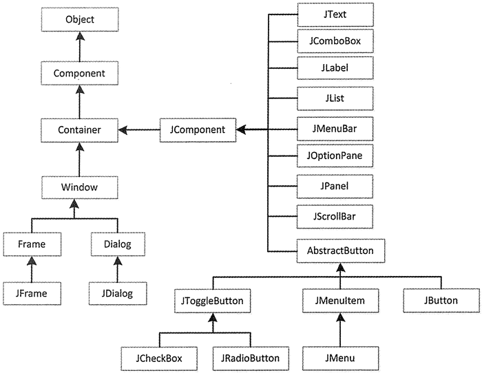 Swing 围绕 JComponent 组件构建,JComponent 则由 AWT 的容器类扩展而来。Swing 组织结构如图 1 所示。