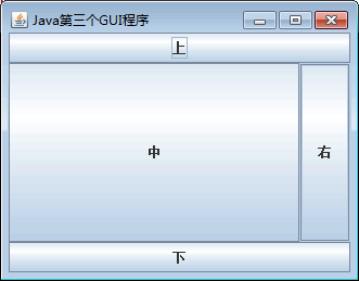 如果未指定布局管理器的 NORTH 区域,即将“frame.add(button1,BorderLayout.NORTH);”注释掉,则 WEST、CENTER 和 EAST 3 个区域将会填充 NORTH 区域,如图 3 所示。