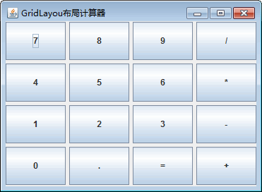 上述程序设置面板为 4 行 4 列、间隙都为 5 像素的网格布局,在该面板上包含 16 个按钮,其横向和纵向的间隙都为 5。该程序的运行结果如图 8 所示。