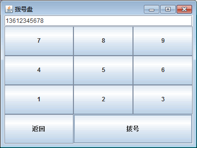 创建一个窗口,使用 GridBagLayout 进行布局,实现一个简易的手机拨号盘。这里要注意如何控制行内组件的显示方式以及使用 GridBagConstraints.REMAINDER 来控制一行的结束。代码的实现如下: