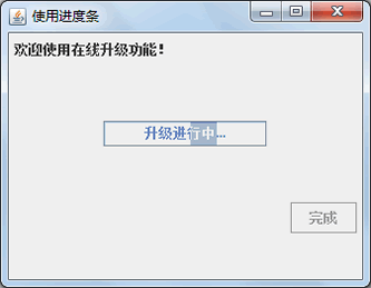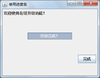 上述代码定义了一个进度条的进度数组 progressValues。线程每隔 1000 毫秒从数组中取一个数字作为当前进度,并使用 JProgressBar 类的 setValue() 方法更新到进度条。最后使进度条显示“升级完成!”字符串,并使“完成”按钮可用。