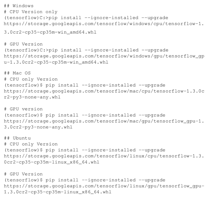 本节将介绍在不同的操作系统(Linux、Mac和Windows)上如何全新安装 TensorFlow 1.3。