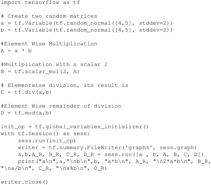 一些其他有用的矩阵操作,如按元素相乘、乘以一个标量、按元素相除、按元素余数相除等,可以执行如下语句: