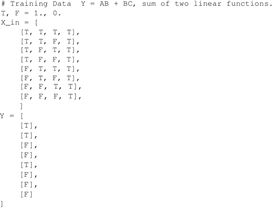 指定训练数据。在这个例子中,取三个输入神经元(A,B,C)并训练它学习逻辑 AB+BC: