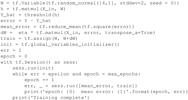 当感知机使用阈值激活函数时,不能使用 TensorFlow 优化器来更新权重。我们将不得不使用权重更新规则: