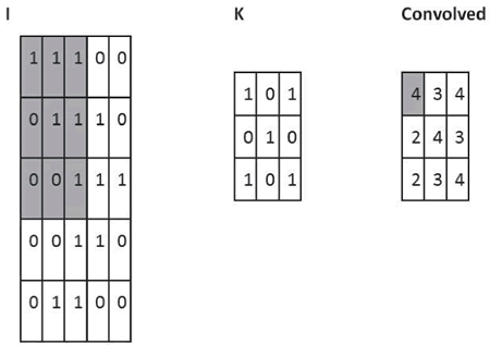 假设想要从原始像素表示中获得移除与输入图像中位置信息无关的相同特征的能力。一个简单的直觉就是对隐藏层中的所有神经元使用相同的权重和偏置。通过这种方式,每层将从图像中学习到独立于位置信息的潜在特征。理解卷积的一个简单方法是考虑作用于矩阵的滑动窗函数。在下面的例子中,给定输入矩阵 I 和核 K,得到卷积输出。将 3×3 核 K(有时称为滤波器或特征检测器)与输入矩阵逐元素地相乘以得到输出卷积矩阵中的一个元素。所有其他元素都是通过在 I 上滑动窗口获得的: