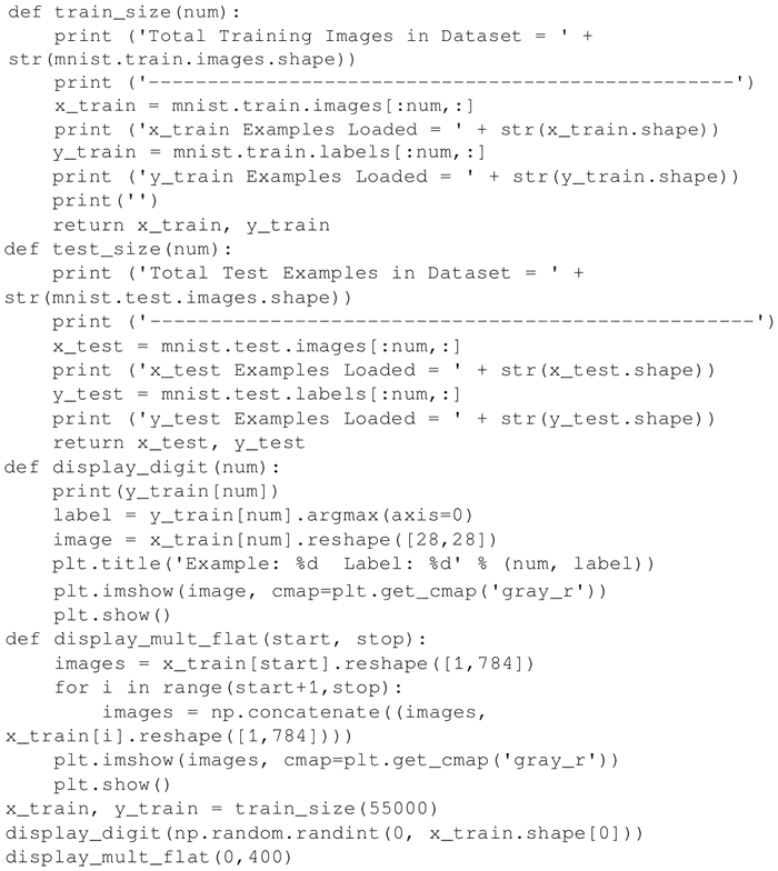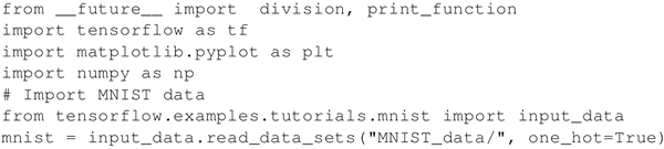 导入 tensorflow、matplotlib、random 和 numpy。然后,导入 mnist 数据集并进行独热编码。请注意,TensorFlow 有一些内置的库来处理 MNIST,我们也会用到它们: