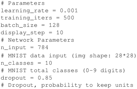 设置学习参数 batch_size和display_step。另外,MNIST 图片都是 28×28 像素,因此设置 n_input=784,n_classes=10 代表输出数字 [0-9],并且 dropout 概率是 0.85,则: