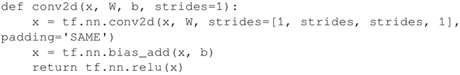 定义一个输入为 x,权值为 W,偏置为 b,给定步幅的卷积层。激活函数是 ReLU,padding 设定为 SAME 模式: