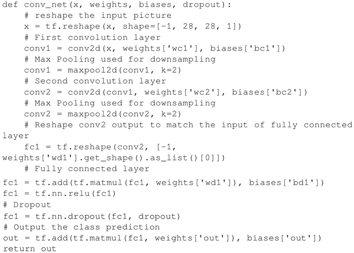定义 convnet,其构成是两个卷积层,然后是全连接层,一个 dropout 层,最后是输出层: