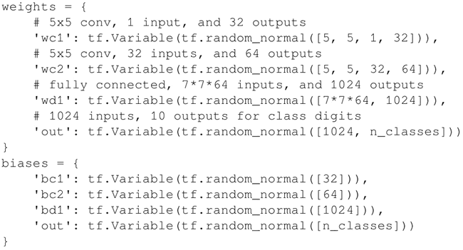 定义网络层的权重和偏置。第一个 conv 层有一个 5×5 的卷积核,1 个输入和 32 个输出。第二个 conv 层有一个 5×5 的卷积核,32 个输入和 64 个输出。全连接层有 7×7×64 个输入和 1024 个输出,而第二层有 1024 个输入和 10 个输出对应于最后的数字数目。所有的权重和偏置用 randon_normal 分布完成初始化: