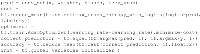建立一个给定权重和偏置的 convnet。定义基于 cross_entropy_with_logits 的损失函数,并使用 Adam 优化器进行损失最小化。优化后,计算精度:
