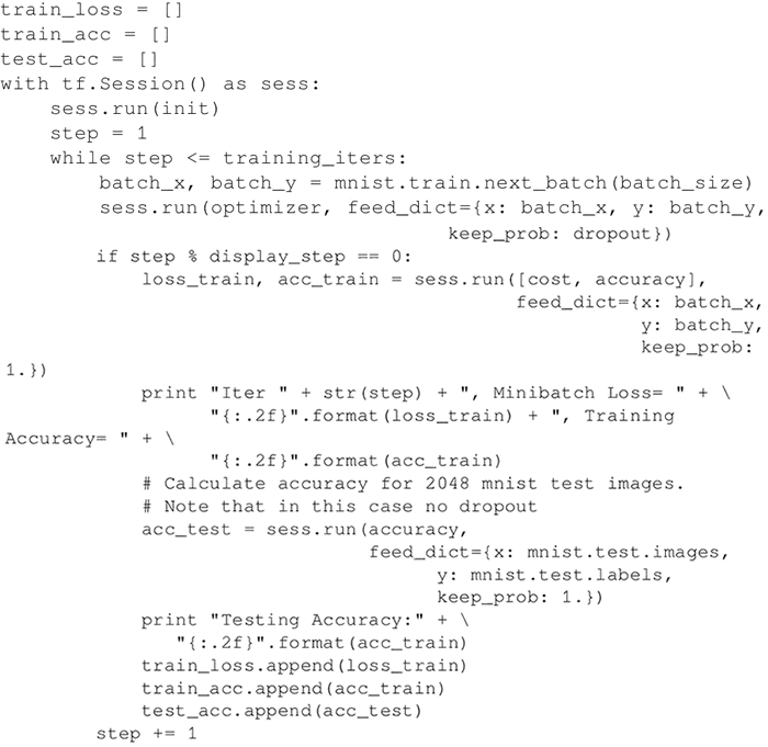 启动计算图并迭代 training_iterats次,其中每次输入 batch_size 个数据进行优化。请注意,用从 mnist 数据集分离出的 mnist.train 数据进行训练。每进行 display_step 次迭代,会计算当前的精度。最后,在 2048 个测试图片上计算精度,此时无 dropout。