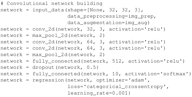 使用之前定义的图片预处理和图片增强操作创建卷积网络。网络由三个卷积层组成。第一层有 32 个卷积核,尺寸是 3×3,激活函数用 ReLU,这一层后使用 max_pool 层用于缩小尺寸。然后是两个卷积核级联,卷积核的个数是 64,尺寸是 3×3,激活函数是 ReLU。之后依次是 max_pool 层,具有 512 个神经元、激活函数为 ReLU 的全连接的网络,设置 dropout 概率为 50%。最后一层是全连接层,利用 10 个神经元和激活函数 softmax 对 10 个手写数字进行分类。请注意,这种特殊类型的 ConvNet 在 CIFAR-10 中非常有效。其中,使用 Adam 优化器(categorical_crossentropy)学习率是 0.001: