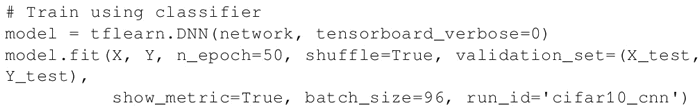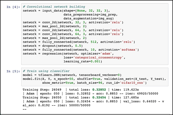 TFLearn 隐藏了许多 TensorFlow 的实现细节,在许多情况下,它可专注于具有更高抽象级别的 ConvNet 的定义。我们的设计在 50 次迭代中达到了 88% 的准确度。以下图片是在 Jupyter notebook 中执行的快照: