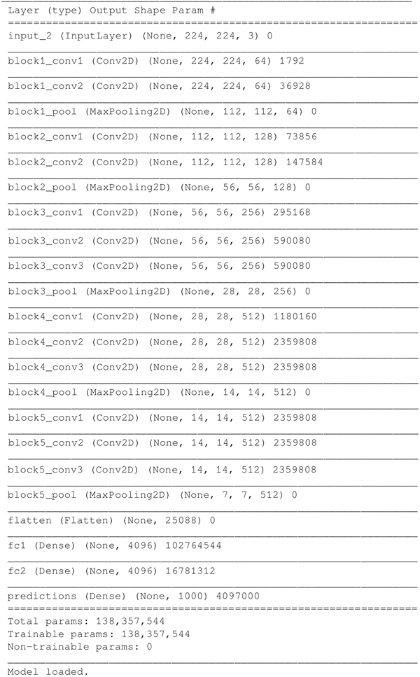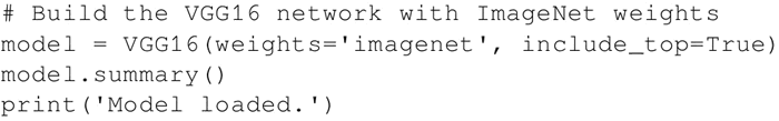 通过使用 Keras 中包含的预构建图层获取 VGG16 网络,并使用 ImageNet 权重进行训练: