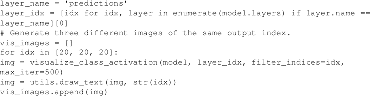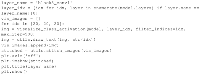 本节将使用 keras-vis,一个用于可视化 VGG 预建网络学到的不同滤波器的 Keras 软件包。基本思路是选择一个特定的 ImageNet 类别并理解 VGG16 网络如何来学习表示它。